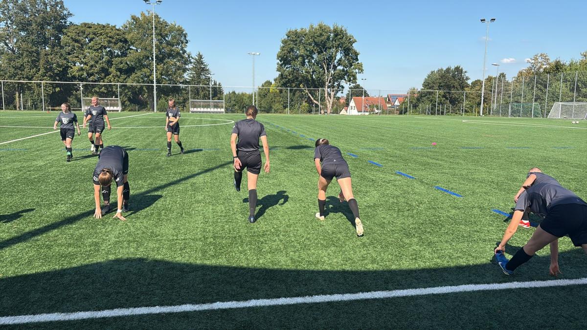 Beim Aufwärmen am Kunstrasen bei strahlendem Sonnenschein